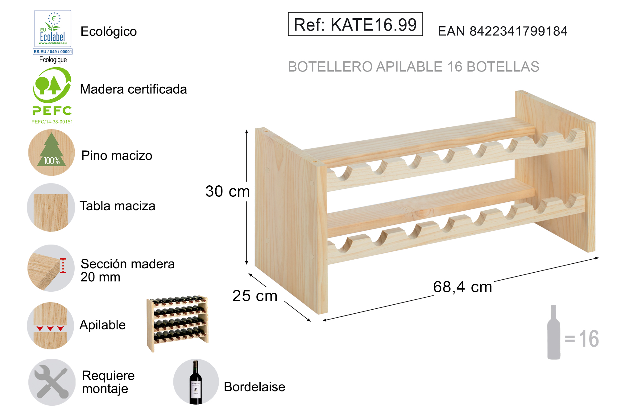 Botellero apilable Katea de madera maciza de pino para 16 botellas (30×68,4x25cm)