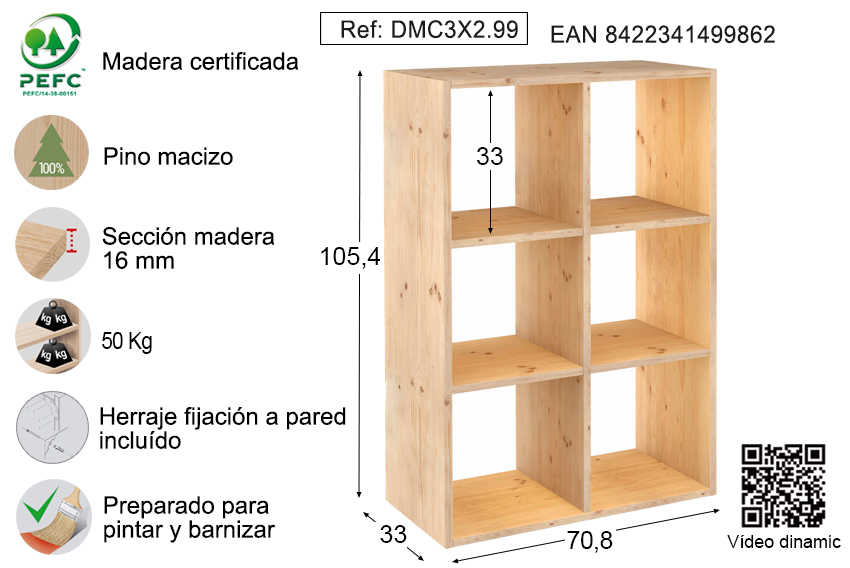 Estantería Dinamic modular con 6 cubos de madera maciza de pino 105,4×70,8x33cm